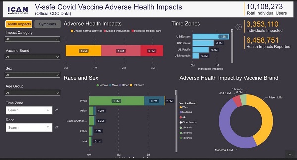 ![]() Click to expand Story source: Gateway Pundit After a successful lawsuit, ICAN was granted access to V-safe COVID Vaccine Injury Data from the CDC. “To make this data public, ICAN activated its legal team. After suing the CDC twice, the CDC capitulated in a court order requiring the release of the data,” according to the company news release. “ICAN has taken the CDC’s official raw data and created a visual dashboard interface for ease of use.” Users will be able to see a visual representation of the more than 144 million lines of health data gathered through ICAN’s lawsuit against the CDC by using the customized dashboard. (See image below) According to the data, Out of the 10 million people who used v-safe, 3,353,110 were hurt. And 6,458,751 health impacts were reported by v-safe users. Options for health impacts were: unable to work or attend school; unable to do your normal daily activities; and/or get care from a doctor or other healthcare professional. Each user could have submitted more than one health impact both during one check-in or over time in multiple check-ins. On Tuesday’s episode of “Fox News @ Night” with Chase Gallagher, human rights and vaccine attorney Aaron Siri discussed the CDC data on vaccine risk and impact. It took 463 days and two lawsuits for CDC to turn over the data to Aaron Siri. “Of the 10 million users within V-safe, 7.7% of them had to seek medical care after vaccination. That is an incredibly high percentage, it appears to me,” Siri said. “7.7 required medical care, talking about emergency rooms, hospitalizations. And on top of that, another 2.5 million, we’re talking 25% missed work or school or had bad reactions to the vaccine,” Gallagher said. |